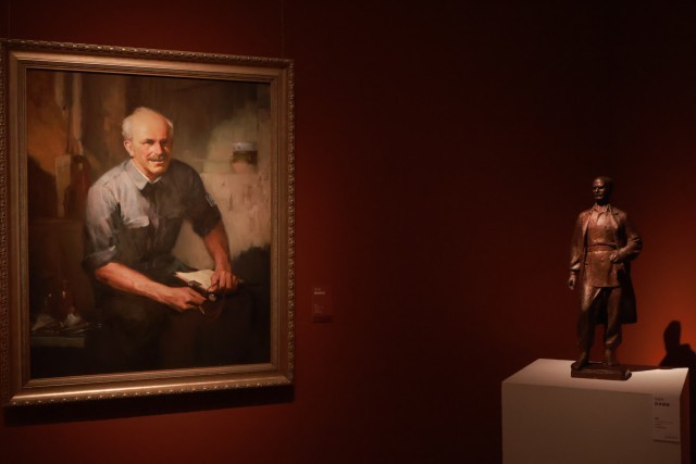 汤小铭创作的油画《满腔热忱》与司徒杰创作的雕塑《白求恩像》。中青报·中青网见习记者 李怡蒙/摄
