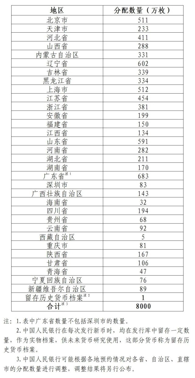 中国人民抗日战争暨世界反法西斯战争胜利80周年双色铜合金纪念币面额为10元,直径为27毫米,材质为双色铜合金,发行数量为8000万枚。各省、自治区、直辖市分配数量如下: