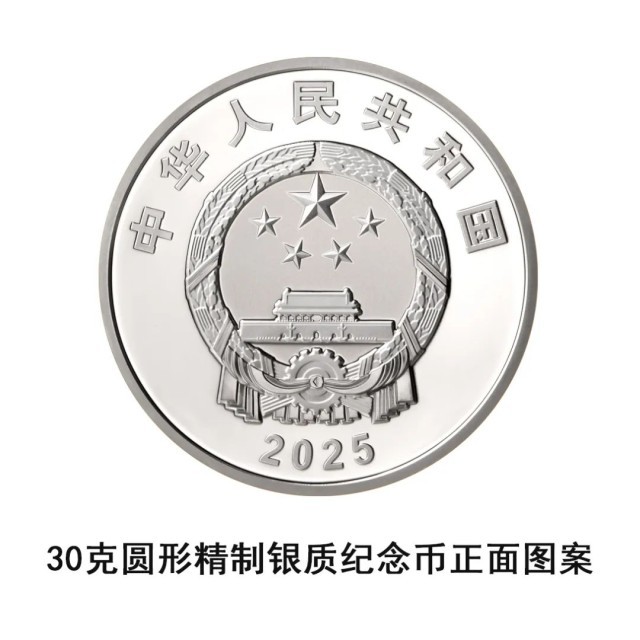 该套金银纪念币正面图案均为中华人民共和国国徽,国徽上方刊“中华人民共和国”国名,下方刊年号“2025”字样。