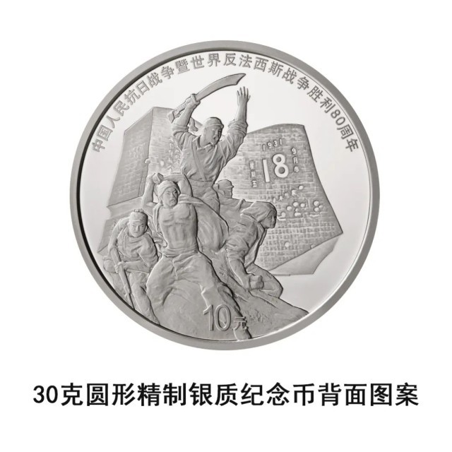 30克圆形银质纪念币背面图案由“大刀进行曲”雕塑、“九·一八”历史博物馆“残历碑”雕塑等元素构成,并刊“中国人民抗日战争暨世界反法西斯战争胜利80周年”字样及面额“10元”字样。