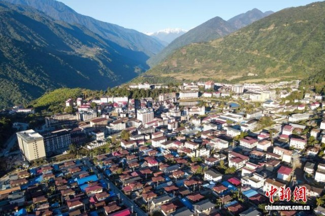 图为2023年12月19日,航拍西藏扎墨公路通车10年后的墨脱县城。江飞波 摄