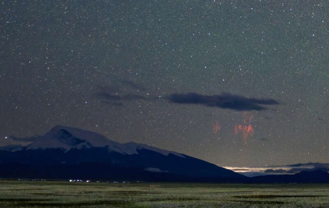 纳木那尼峰与“红色精灵”闪电。李佳/摄