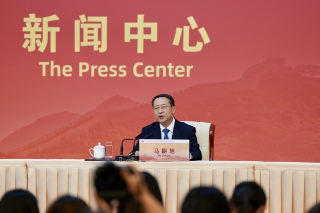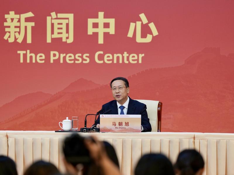8月29日上午,中国人民抗日战争暨世界反法西斯战争胜利80周年纪念活动新闻中心在梅地亚新闻中心二层新闻发布厅举办第二场记者招待会,外交部副部长马朝旭介绍坚持和平发展、推动构建人类命运共同体有关情况,并回答记者提问。中青报·中青网记者 李隽辉/摄