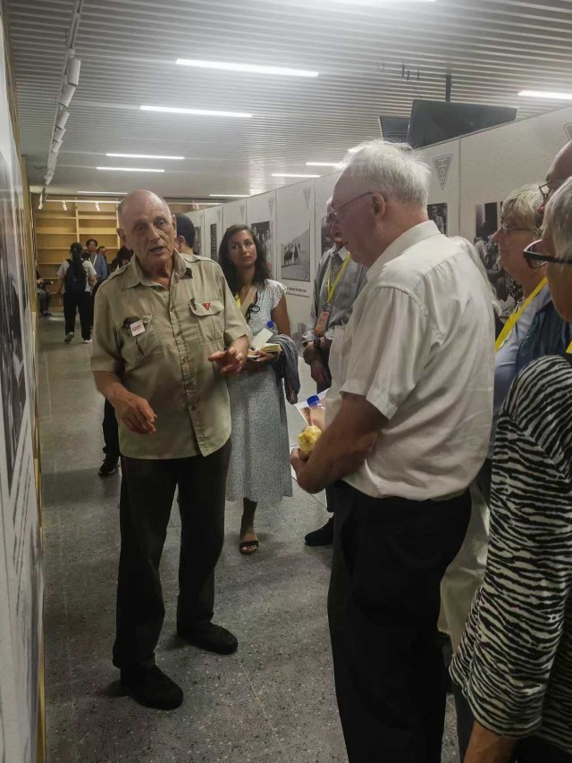 8月29日,北京市海淀区阳台山爱国主义教育基地,白求恩医生的亲属沃伦·白求恩(左三)在观看白求恩生前照片。中青报·中青网记者张国/摄