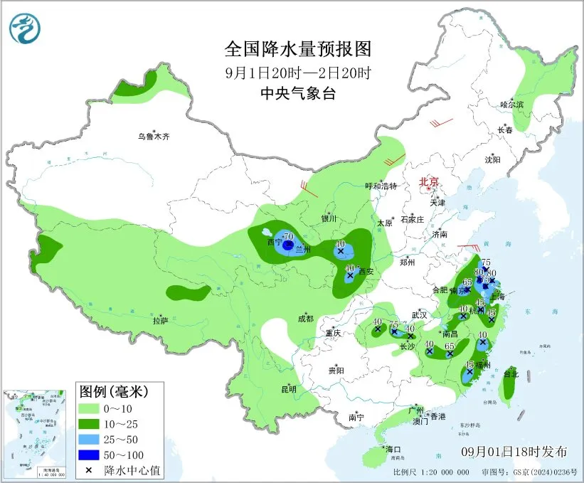 新疆北疆北部、西藏中东部、西北地区东部、安徽东部、江苏中南部、浙江中北部、湖南北部、江西中部和北部、福建中东部、台湾岛大部等地部分地区有中到大雨,其中,青海东部、江苏中南部、湖南北部、江西东部等地部分地区有暴雨。