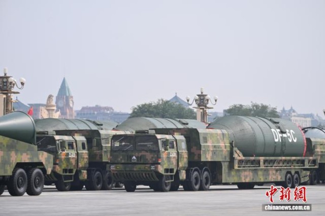 9月3日,纪念中国人民抗日战争暨世界反法西斯战争胜利80周年大会在北京隆重举行。图为核导弹第二方队“东风-5C”液体洲际战略核导弹驶过天安门广场。 中新网记者 赵文宇 摄