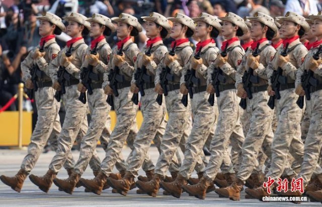 9月3日,纪念中国人民抗日战争暨世界反法西斯战争胜利80周年大会在北京隆重举行。图为民兵方队接受检阅。该方队全部由女民兵组成,这是民兵首次亮相以纪念抗战胜利为主题的阅兵活动。 中新网记者 赵文宇 摄