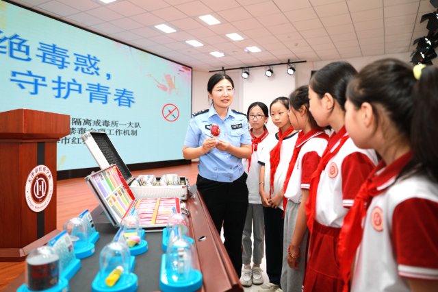 天津市戒毒管理局禁毒大使、天津广播电台人气主播王野现场助力,与戒毒警察同台主持,通过知识科普、趣味问答等形式,引导学生主动思考、积极抢答,在轻松活跃的氛围中,切实增强青少年识毒防毒拒毒的意识和能力。天津市女子强制隔离戒毒所警察则紧扣毒情形势、毒品来源、吸毒危害、识毒技巧等内容,通过典型案事例揭示毒品危害,阐释禁毒法律法规,传授毒品防范技巧,引导青少年懂法守法,推动“健康人生,绿色无毒”理念深入人心。