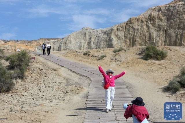 ↑ 9月8日,游客在新疆阿勒泰地区福海县乌伦古湖海上魔鬼城景区拍照。