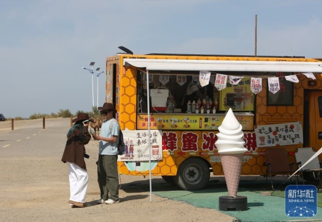 ↑ 9月8日,游客在新疆阿勒泰地区福海县乌伦古湖海上魔鬼城景区游玩。