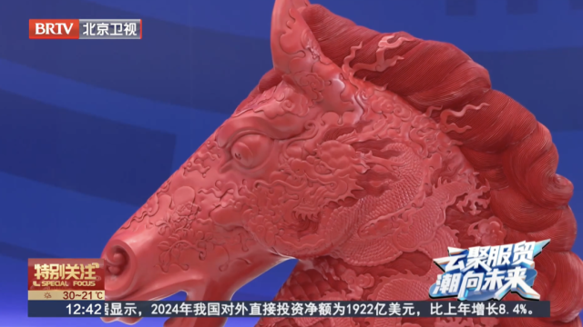 在展现科技魅力的同时,新闻中心也融入了浓厚的北京文化元素,特别是非遗文化,让各地记者一走进这里就能感受到北京独特的文化底蕴:现场陈列了包括“燕京八绝”在内的传统工艺精品及创新文创产品。一件名为“龙马精神”的雕漆工艺作品尤为醒目,以骏马为造型,雕刻有降龙、海水江崖及牡丹纹饰,寓意家国平安。