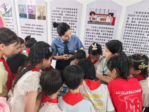面对困境女童监护缺失与法律意识薄弱等难题,团队大胆创新,开设“护蕾小课堂”,将服务范围拓展到全县9所中小学,惠及3000余名师生。暑假前夕,在拜城县温巴什乡中学,一场自编自导的“向校园欺凌说不”情景剧演出中,当“检察官妈妈”扮演的老师提问“遇到欺负该怎么办”,台下的孩子们齐声回答:“找检察官妈妈!”
