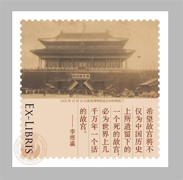 藏书票上半部分是1925年10月10日故宫博物院成立时悬挂有“故宫博物院”匾额的神武门;下半部分是故宫博物院首任掌门人李煜瀛的话:“希望故宫将不仅为中国历史上所遗留下的一个死的故宫,必为世界上几千万年一个活的故宫。”