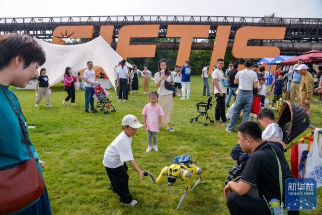 ↑ 9月13日,在北京首钢园,小朋友在2025年服贸会文旅服务户外展区与AI具身智能机器人“AI小蚂ROBOT”互动。