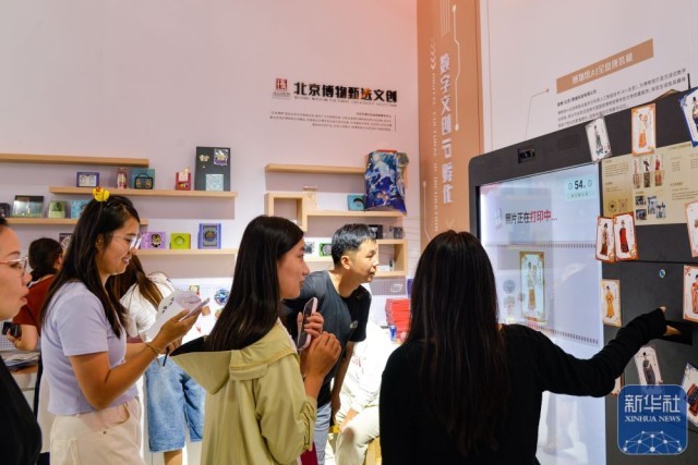 ↑ 9月13日,在北京首钢园,参展者在2025年服贸会文旅服务展馆北京市文物局展台观看、了解数智赋能展览展示。