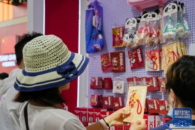 ↑ 9月13日,在体育服务专题展区中国国家队展台,参观者选购国家队文创产品。