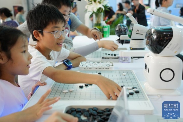 ↑ 9月13日,在文旅服务专题展区经开区展台,小朋友和机器人下五子棋。
