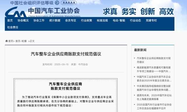 中国青年报客户端讯(中青报·中青网记者 贾骥业)9月15日,中国汽车工业协会(以下简称“中汽协”)发布《汽车整车企业供应商账款支付规范倡议》,围绕订单确认、交付与验收、支付与结算、合同期限等环节,对整车企业与供应商企业采购合同中账款支付相关内容作规范倡议。