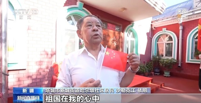 新疆塔城市新城街道哈尔墩社区居民 阿依霞·斯马克:升国旗,每一个民族自己的衣服穿好,就是尊重。