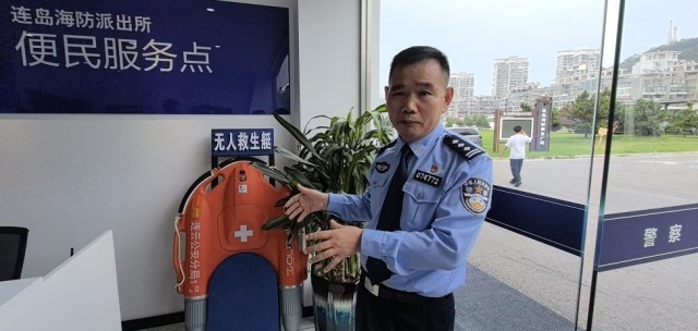 连岛海防派出所所长金琦向记者介绍警务室便民服务点的无人救生艇。中青报·中青网记者何春中/摄