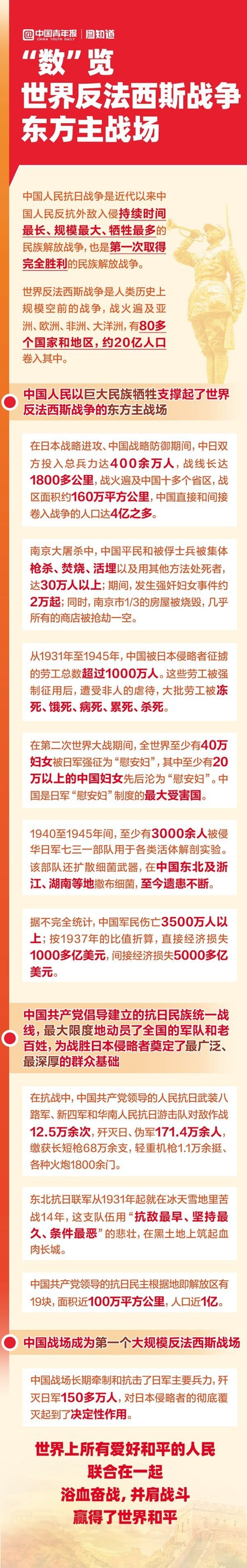 中国人民抗日战争是近代以来中国人民反抗外敌入侵持续时间最长、规模最大、牺牲最多的民族解放斗争,也是第一次取得完全胜利的民族解放斗争。透过这组数字,铭记历史,迈向和平未来。