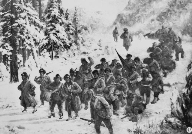 图为描绘抗日联军艰苦斗争的油画。新华社发