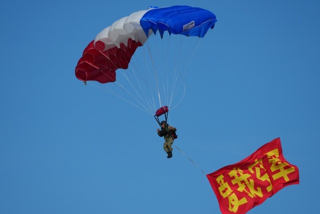 紧随其后的,是一场精彩的空降行动。数名空降兵武装跳伞员背负着先进的降落伞与全套作战装备,以战斗的姿态从机舱相继跃出,在空中熟练操作着降落伞,不断调整方向和速度,以编队形式,直奔指定地域。随着一名名队员精准落地,现场再次响起热烈掌声。