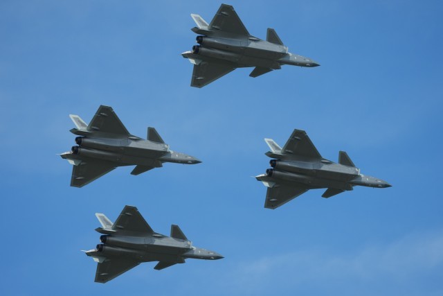 万众期待中,4驾歼-20战机劲舞苍穹。它们在空中组成一个巨大的菱形,以恒定的坡度与速率,在碧空中盘旋,既是一次壮美的表演,更是一次具备实战性质的检验。这之后,四机编队两两分组,上演精彩的四机战术对穿。只见,左前方双机与右前方双机,从不同方向、不同高度,向预定地点疾驰汇聚,在电光火石之间完成对穿。“这震撼人心的对穿,模拟了复杂战场环境下,多机群遭遇时,一招制敌的‘杀招’!”现场一名军事专家说。