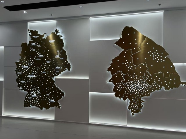 江苏省太仓市太仓中德合作展示中心展示的德国和太仓的地图(左为德国,右为太仓),其上星形图案密密麻麻。据了解,德国地图上的星星,标示了在太仓的德企来自哪里,太仓地图上的星星,则显示德企在太仓的落户情况。中青报·中青网记者 贾骥业/摄