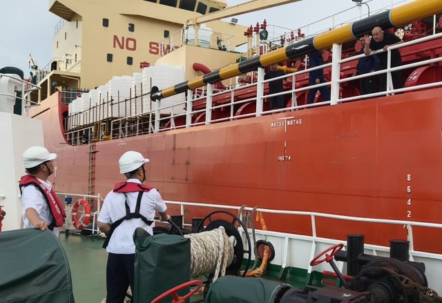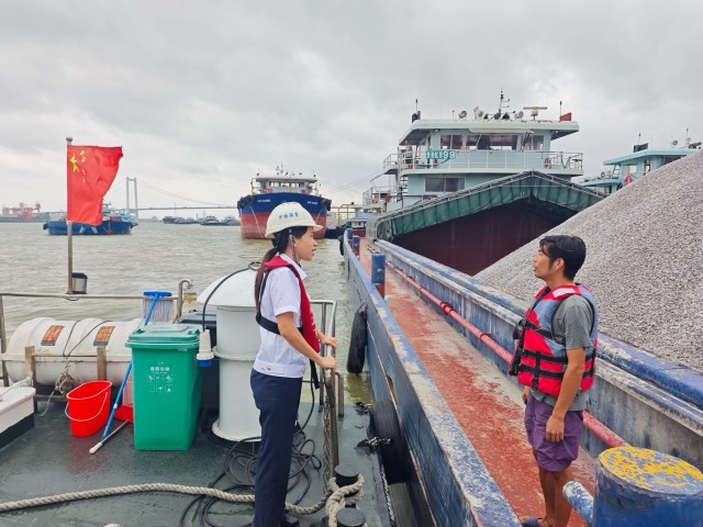 海事人员强化现场船舶防台安全提醒。陈秀慧/摄
