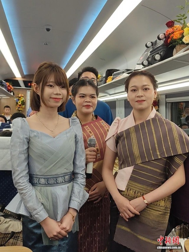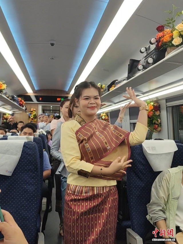 老挝留学生吉姆握着话筒,用略带口音的中文向车厢内的旅客问好。她身着一袭流光溢彩的传统服饰,站在C9521次中老铁路国际列车的走道中央,笑意粲然。窗外,云南山水如画卷般缓缓掠过。