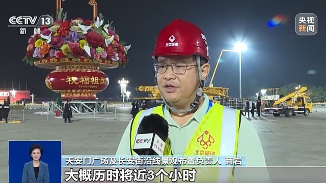 天安门广场及长安街沿线景观布置负责人 商岩:从吊装准备工作开始,一直到吊装完成,大概历时将近3个小时。保证篮盘和篮体的紧密结合,因为花篮在插置的过程中有一个观赏角度,所以在吊装和合龙整个过程当中,四面相应的观赏面都要有工作人员要盯着,这个面不能有任何的变化。