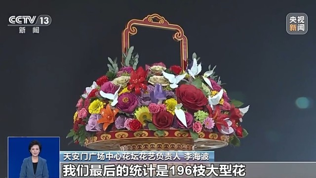 总台记者 魏雨彤:今年的“祝福祖国”花篮篮体高16米,篮内选取了18种美好寓意的花卉,比如说月季,首次作为焦点花寓意和平希望,向日葵寓意自由幸福。值得一提的是,今年还首次将灵动的动物元素融入其中,10只和平鸽正以三种不同的姿态翱翔于花篮之上,成为今年的新亮点。