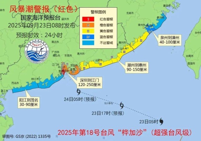 受超强台风“桦加沙”影响,国家海洋预报台今天(23日)早上将风暴潮、海浪预警级别双双升级为红色。