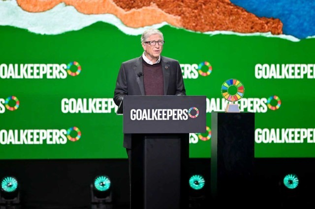 盖茨基金会主席比尔·盖茨在2025年目标守卫者大会上发言。盖茨基金会供图