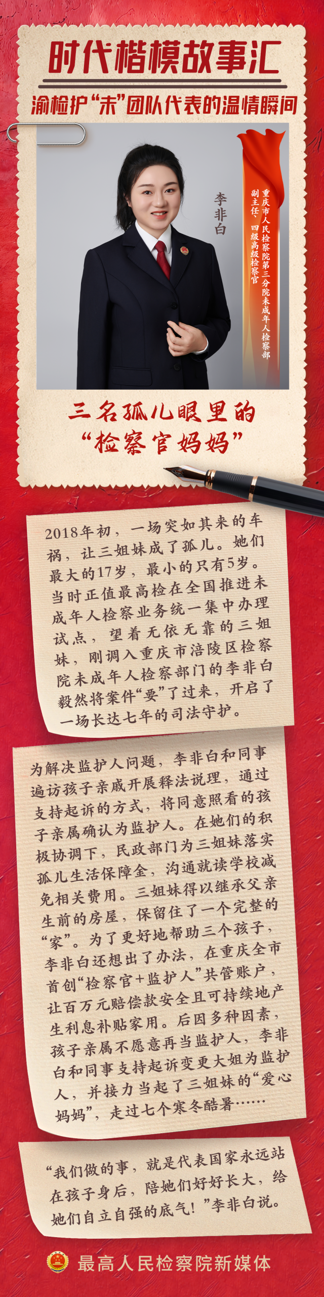 “守护孩子,就是守护未来”“为了孩子,所有的付出都是值得的”……日前,中央宣传部授予重庆检察未成年人保护工作团队代表(简称“渝检护‘未’团队代表”)“时代楷模”称号,褒扬他们是“德法相伴、倾情守护未成年人健康成长的典范”。