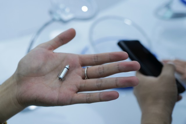 9月24日,海南博鳌乐城先行区,媒体记者在参观经导管植入式无导线起搏系统。中青报·中青网记者 赵迪/摄