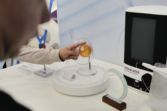 9月24日,海南博鳌乐城先行区,媒体记者在参观胃内球囊器械。中青报·中青网记者 赵迪/摄