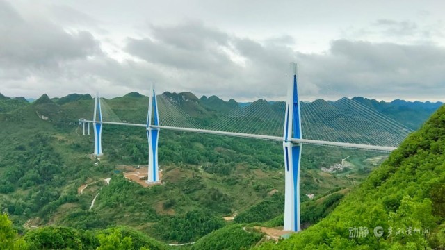 位于黔南州平塘县槽渡河大峡谷之上,是国内山区跨径最大的三塔斜拉桥,桥体采用了造型优美的空间钻石形索塔,有“天空之桥”的美誉。大桥索塔为钢筋混凝土空心薄壁结构,中塔总高332米,相当于约110层的高楼,是世界第一高钢筋混凝土桥塔。大桥建设者采用的钢梁整节段纵移转体悬拼工艺,为国内首创。大桥的建成,为当地旅游、物流等产业发展注入强劲动力。