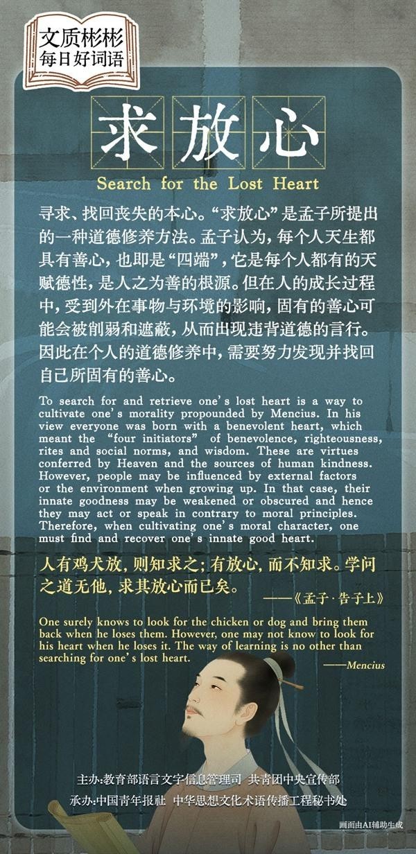 寻求、找回丧失的本心。“求放心”是孟子提出的一种道德修养方法。孟子认为,每个人天生都具有善心,也即是“四端”,它是每个人都有的天赋德性,是人之为善的根源。但在人的成长过程中,受到外在事物与环境的影响,固有的善心可能会被削弱和遮蔽,从而出现违背道德的言行。因此在个人的道德修养中,需要努力发现并找回自己所固有的善心。