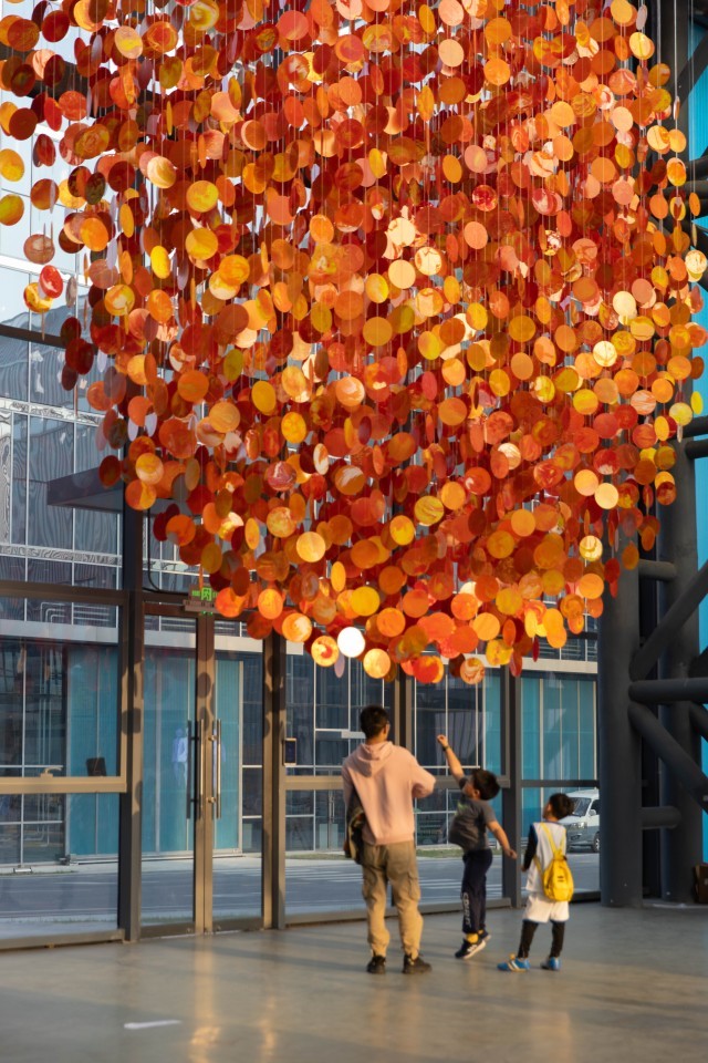 2023年首届中国(合肥)国际科学艺术节活动中,张兆宏邀请3000个孩子用流体画制造“湍流”并将画作集合成太阳图案,展项名为《造太阳》。受访者供图