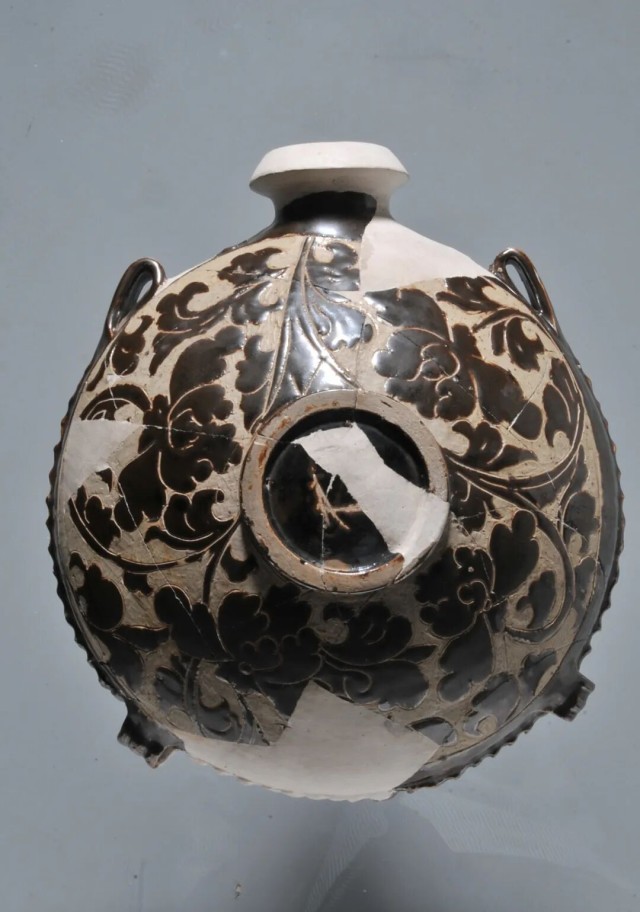 其中,1986年出土于灵武窑址的“黑釉剔刻花四系扁壶”,是西夏瓷器中最具民族特色的代表。它体态轻盈,两侧四系便于穿绳携带,其造型灵感显然来源于游牧民族用于盛水的皮囊壶。然而,其腹部精美的剔刻花纹,又展现了高超的制瓷工艺。这一件器物,将党项人“马背为家”的游牧习性与其吸收农耕文明技术成果的智慧,完美融合于一身。