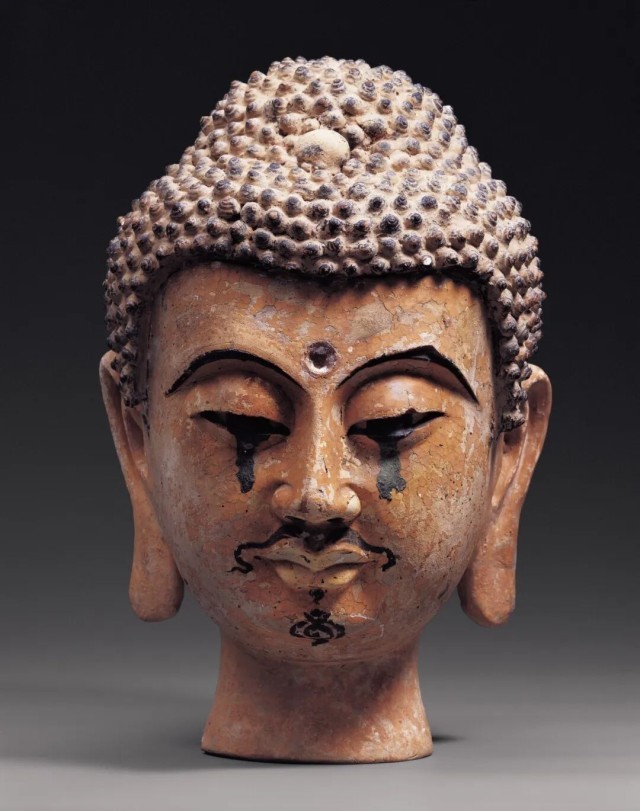 1990年出土于贺兰县宏佛塔的“彩绘泥塑佛头像”,佛像面部圆润饱满,线条大气,富有唐代造像的遗风,是西夏吸收继承唐文化的典型物证。而其眉间白毫、乌亮眼珠乃至因高温而溢出、宛若泪痕的黑色釉料,又为其赋予了独特的神韵与悲悯之感,体现了西夏在佛教艺术上的再创造。