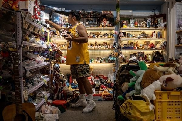 8月21日,北京,一名年轻人正在一家二手商店的玩具区“淘宝”。对不少年轻人来说,除了性价比,二手商品的稀缺性和独特性也是他们选购时考量的重要因素。姚沐含/摄