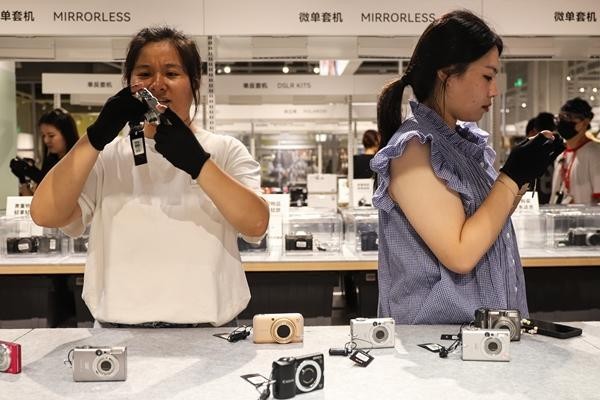 9月6日,北京一家大型二手交易平台的线下商店内,两名年轻人正在选购二手CCD相机(一种使用电荷耦合器件作为图像传感器的数码相机)。近年来,此类复古相机正在重新受到关注,成为年轻人们记录生活的“新宠”。姚沐含/摄