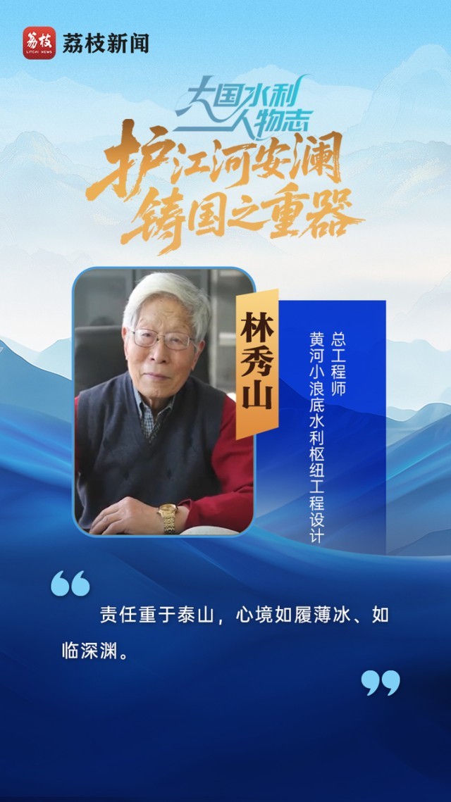 1963年,24岁的林秀山从清华大学水利系毕业,开始了漫长而辉煌的治黄生涯。1987年,他接下黄河小浪底水利枢纽设计总工程师的重任,带领团队完成试验研究四百多项,绘制图纸近万张,组织完成重大技术攻关400多项,创造了多项世界纪录。2001年,小浪底水利枢纽建成后,黄河下游的防洪标准从60年一遇提高到1000年一遇,基本解除了黄河凌汛威胁,黄河下游再没有发生断流现象,沿黄52个城镇的供水与河南、山东3000多万亩耕地灌溉得以保证。
