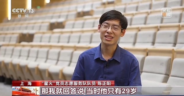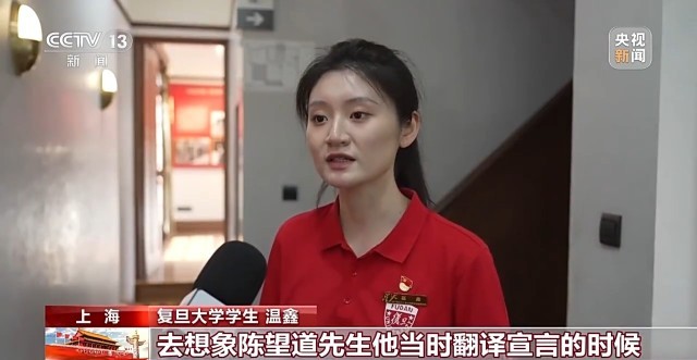 “星火”党员志愿服务队队员 陈正阳:在讲解过程当中都会获得思考,有观众会问说当时陈望道翻译宣言时多少岁,我回答说当时他只有29岁。100多年前的90后00后这一批有志青年经历了这样艰辛的探索,为此付出巨大的代价,我们当下年轻人也要树立起为国家强盛的一个理想和坚定不移的信仰,要更有锋芒和锐气,拿出时不我待的勇气投身到中国式现代化的建设,服务国之所需。