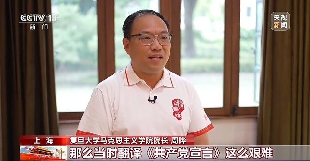 复旦大学马克思主义学院院长 周晔:实际上翻译《共产党宣言》本身是非常艰难的,望道先生用了比平时译书五倍的功夫,把《共产党宣言》翻译了出来。在解放之后,也有人问他当时翻译《共产党宣言》这么艰难,还有危险,为什么还要去翻译?陈望道说因为我信仰马克思主义。