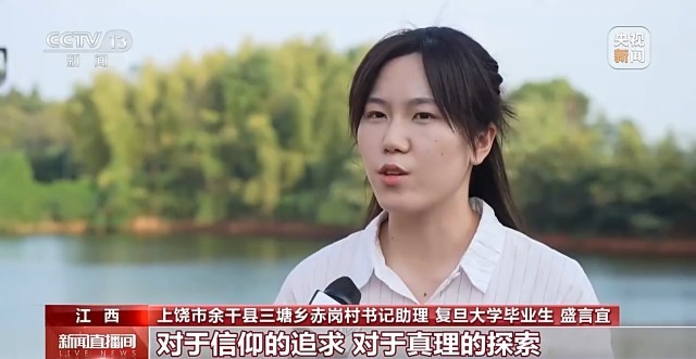 上饶市余干县三塘乡赤岗村书记助理 复旦大学毕业生 盛言宜:对于信仰的追求,对于真理的探索,让我们在复杂的环境中保持定力,保持初心。基层给了我们干事创业施展才华的平台,我们要把知识、技术、理念,真真正正的用在老百姓需要的地方,为红色文化的传承注入新的活力,为中国式现代化贡献青春力量。