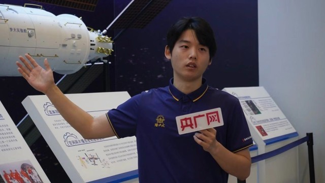 学生讲解员郭镇宇介绍由哈工大参与研制的问天实验舱小机械臂(央广网发 王语诗 摄)